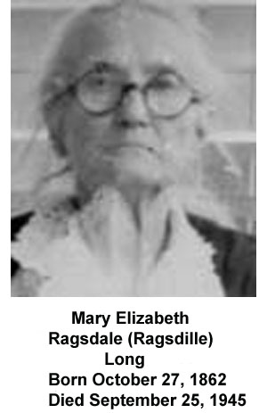 On July 27, 1881, Mary Elizabeth Ragsdale was married to Starl Davidson Long (March 23, 1863 - April 10, 1939) in Duffau, Texas. Mary and Starl Long had four children. Their first child, a son, was born on February 21, 1882, and lived but one day. The second child, also a son, was born on April 25, 1883 near Duffau, Texas, and was named Jeams Edward Long (called "Eddie"). Eddie died of croup at the age of two.